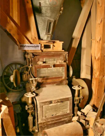 Im Erdgeschoss befinden sich zwei Walzenstühle, eine Schrotmühle und eine Spitz- und Schälmaschine, Fabrikat Engelsmann.