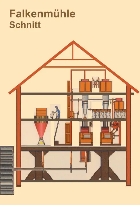 Im Zwang- und Bannrecht des Feudalismus konnte nicht jeder Müller nach Lust und Laune eine Mühle aufmachen. Der Lehnsherr vergab die Mühle als Privileg, und der "Mühlenzwang" bestimmte, dass alle seine Untertanen ausschließlich in der landesherrlich privilegierten Mühle mahlen lassen mussten. Der letzte Umbau des Mühlengebäudes der Falkenmühle war 1924. Er brachte den Mahlbetrieb der Kornmühle auf den damals modernsten technischen Stand. Die Mühlentechnik konnte sich nun über vier Stockwerke erstrecken. Dieser Zustand blieb im Wesentlichen ohne Änderung bis heute erhalten. Durch den großen finanziellen Kraftakt wurde eine moderne Landmühle geschaffen.