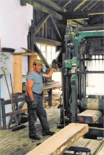 Bei der Sägemühle schließlich, der zweiten Mühlenform der hier beschriebenen Mühlenanlage, bezieht sich die Bezeichnung nicht mehr auf die Mahleinrichtung, sondern ausschließlich auf die Arbeitstätigkeit. Bereits der Großvater von Benno Helbling, Ludwig Helbling, führte das Sägewerk, wann genau die ehemalige Waldenburg- Mahlmühle in ein Sägewerk umgebaut wurde, ist nicht bekannt. Sägemühlen sind lange nicht so alt wie Wassermühlen oder das Wasserrad. Die Idee zum Bau einer Säge ist erstmals im 13. Jahrhundert dokumentiert. Die Abbildung zeigt das heute noch in der Sägemühle vorhandene Gatter mit dem Müller Benno Helbling. Das Gatter wurde zuletzt durch einen Elektromotor angetrieben. Den Strom dazu erzeugte man im Wasserkraftwerk. Sobald das Gatter anlief, flackerte überall auf dem Gelände der Mühle im Rhythmus der sich auf und nieder bewegenden Säge, das Licht. 2001 wurde das Gatter so stark beschädigt, dass sich eine Reparatur nicht mehr lohnte.