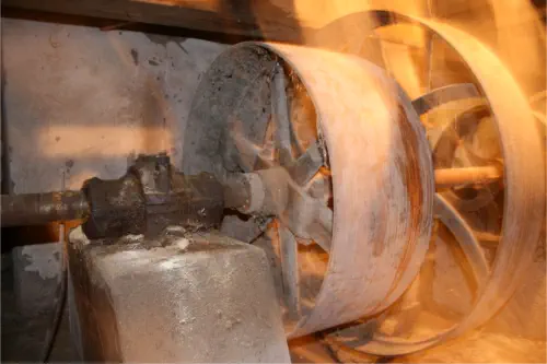 Die technische Ausstattung der Kornmühle, die Mühlentechnik ist heute noch vorhanden. Im Untergeschoss befindet sich die Haupttrans- mission mit ihren Ölschmierlagern und gusseisernen Flachriemenscheiben für den Antrieb der Müllereimaschinen. Seitlich angebaut in der Wieslauter, ist der Turbinenraum mit einer Turbine Escher Wyss.
